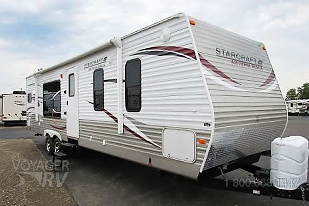 The Pre-owned 2012 Starcraft Autumn Ridge 305RKS, measuring approximately 35′ in length, a no bunks floorplan, sleeping up to 2 people, queen bed, equipped with 1 slide-outs, and a free standing dining area.